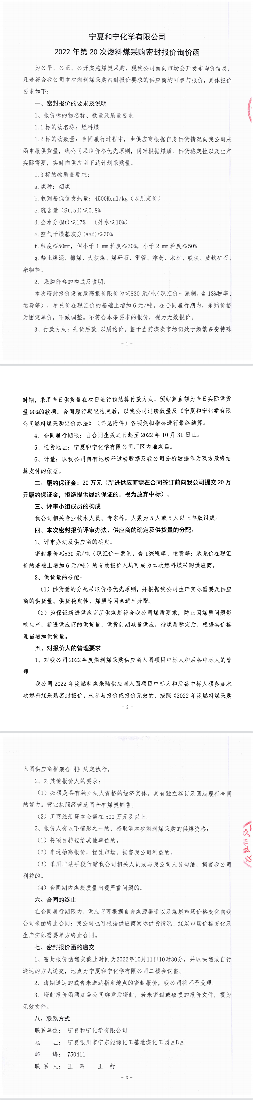 寧夏和寧化學有限公司2022年第20次燃料煤采購密封報價詢價函