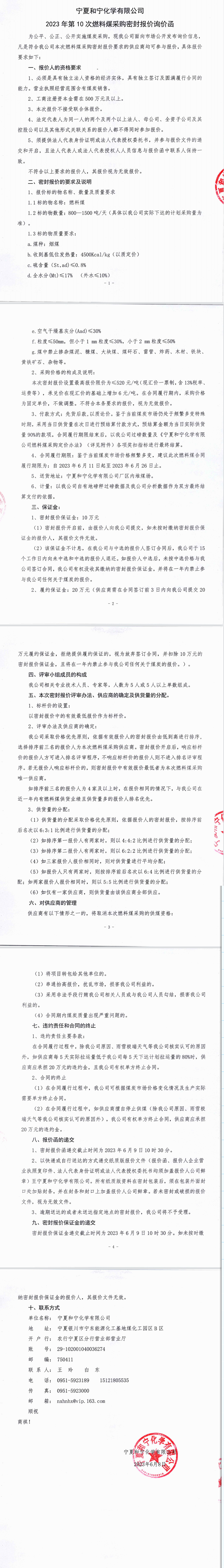 寧夏和寧化學有限公司2023年第10次燃料煤采購密封報價詢價函
