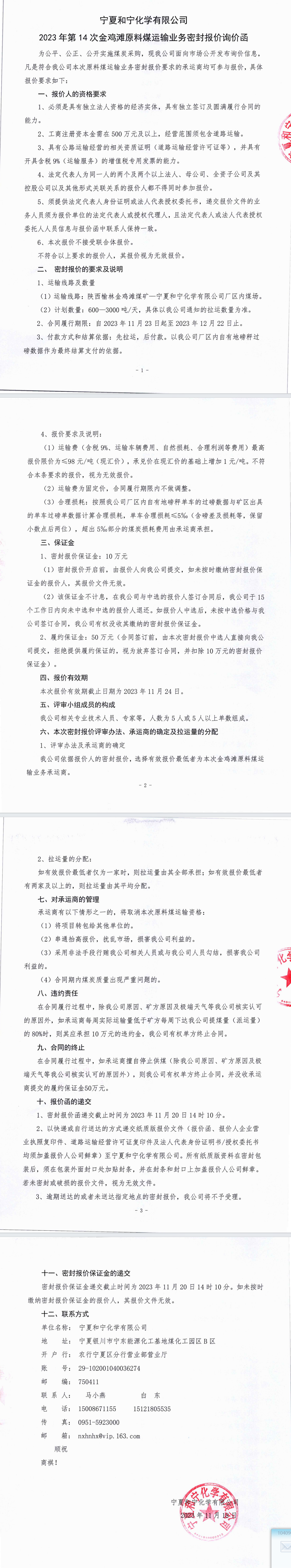 寧夏和寧化學(xué)有限公司2023年第14次金雞灘原料煤運(yùn)輸業(yè)務(wù)密封報(bào)價(jià)詢價(jià)函附件