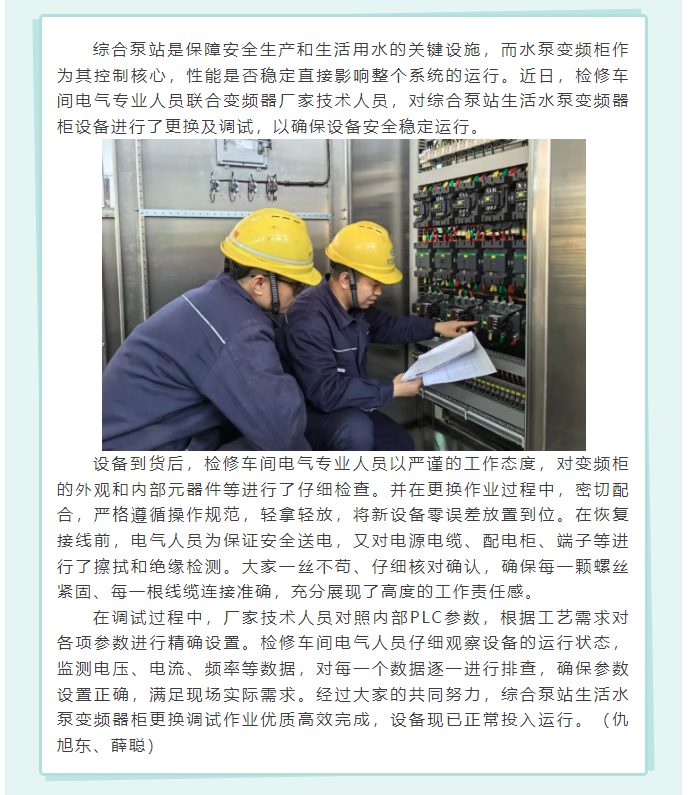 檢修車間完成生活水泵變頻器柜更換工作