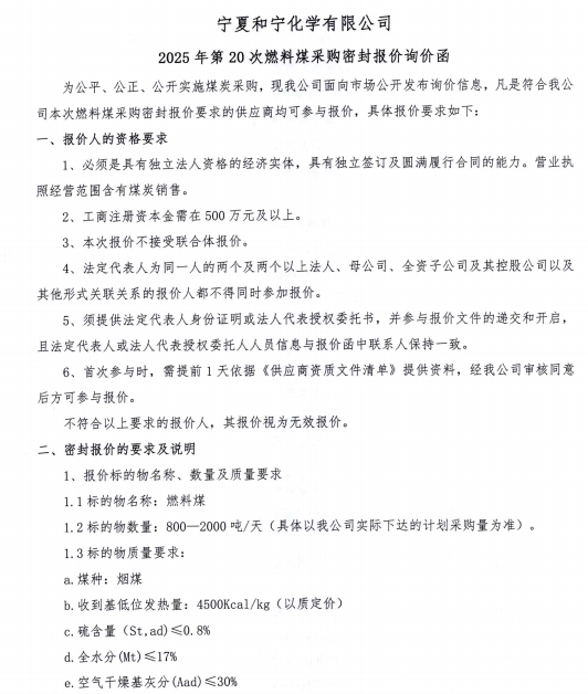 寧夏和寧化學有限公司2025年第20次燃料煤采購密封報價詢價函.pdf [全文]