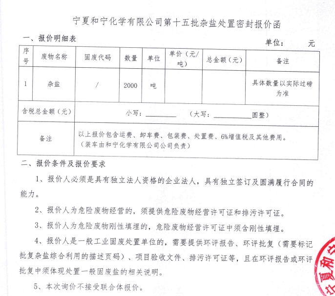 寧夏和寧化學有限公司第十五批雜鹽處置密封報價函.pdf [全文]