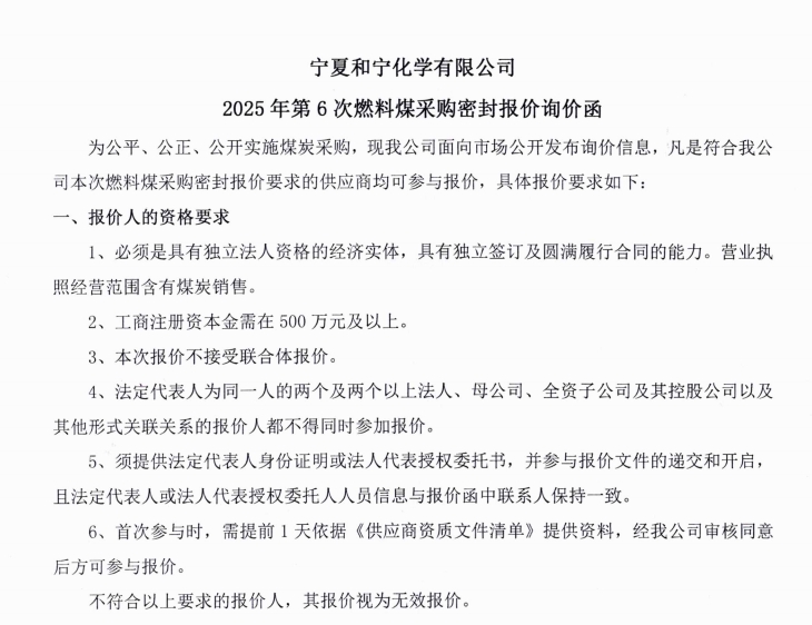 寧夏和寧化學有限公司2025年第6次燃料煤采購密封報價詢價函.pdf [全文]