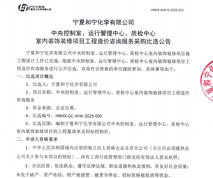 寧夏和寧化學有限公司中央控制室、運行管理中心、質檢中心室內裝飾裝修項目工程造價咨詢服務采購比選公告.pdf [全文]