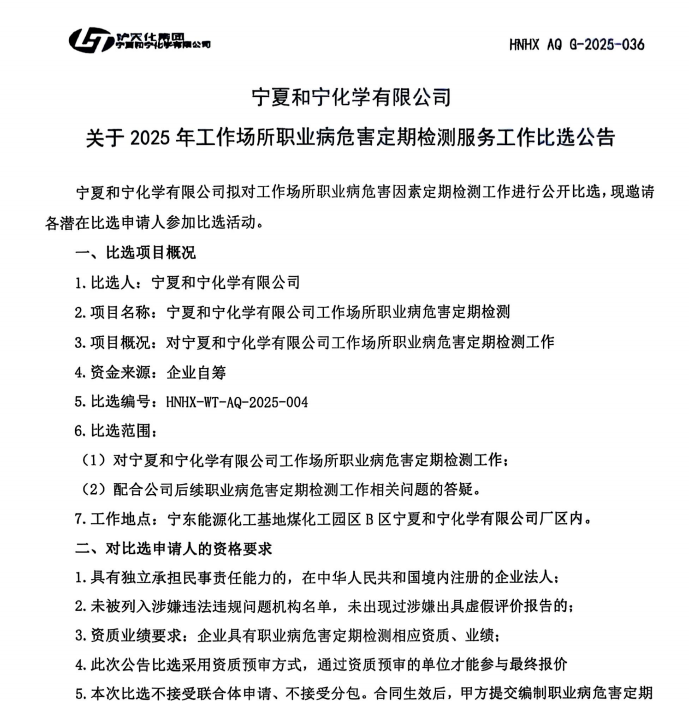寧夏和寧化學有限公司關于 2025 年工作場所職業病危害定期檢測服務工作比選公告.pdf [全文]