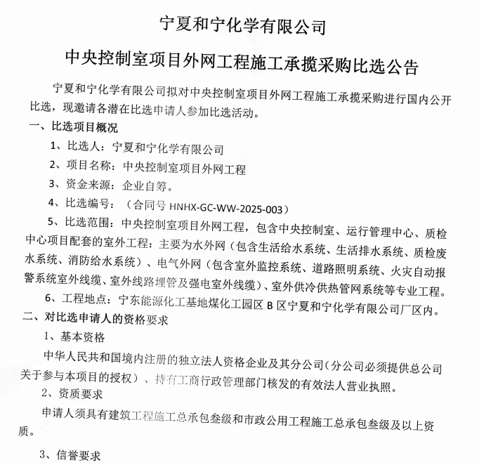 寧夏和寧化學(xué)有限公司中央控制室項(xiàng)目外網(wǎng)工程施工承攬采購(gòu)比選公告.pdf [全文]