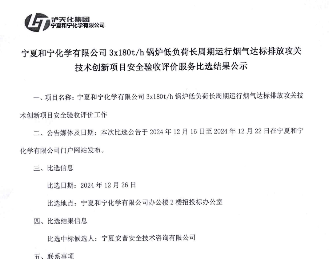 寧夏和寧化學有限公司3x180th鍋爐低負荷長周期運行煙氣達標排放攻關技術創新項目安全驗收評價服務比選結果公示.pdf [全文]