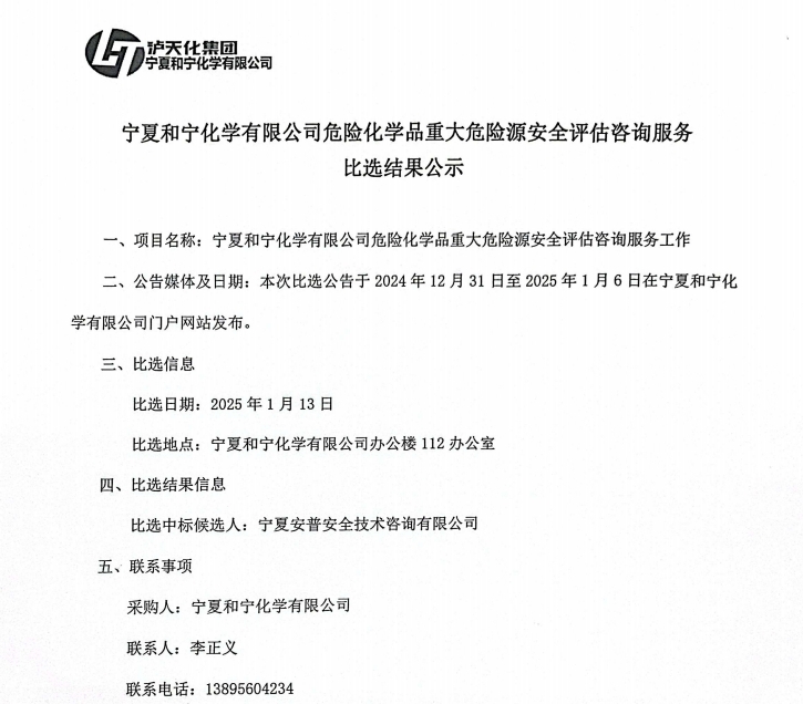 寧夏和寧化學有限公司危險化學品重大危險源安全評估咨詢服務比選結果公示.pdf [全文]