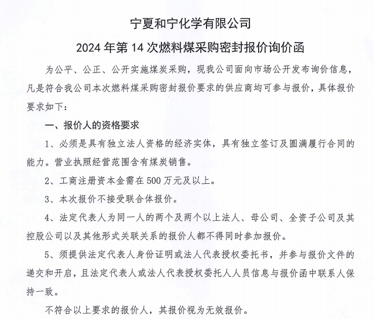寧夏和寧化學(xué)有限公司2024 年第 14 次燃料煤采購密封報價詢價函.pdf [全文]