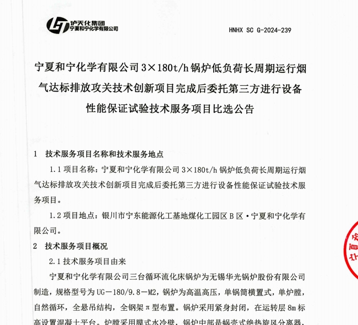 寧夏和寧化學(xué)有限公司3x180t/h鍋爐低負(fù)荷長周期運(yùn)行煙氣達(dá)標(biāo)排放攻關(guān)技術(shù)創(chuàng)新項(xiàng)目完成后委托第三方進(jìn)行設(shè)備性能保證試驗(yàn)技術(shù)服務(wù)項(xiàng)目比選公告.pdf [全文]
