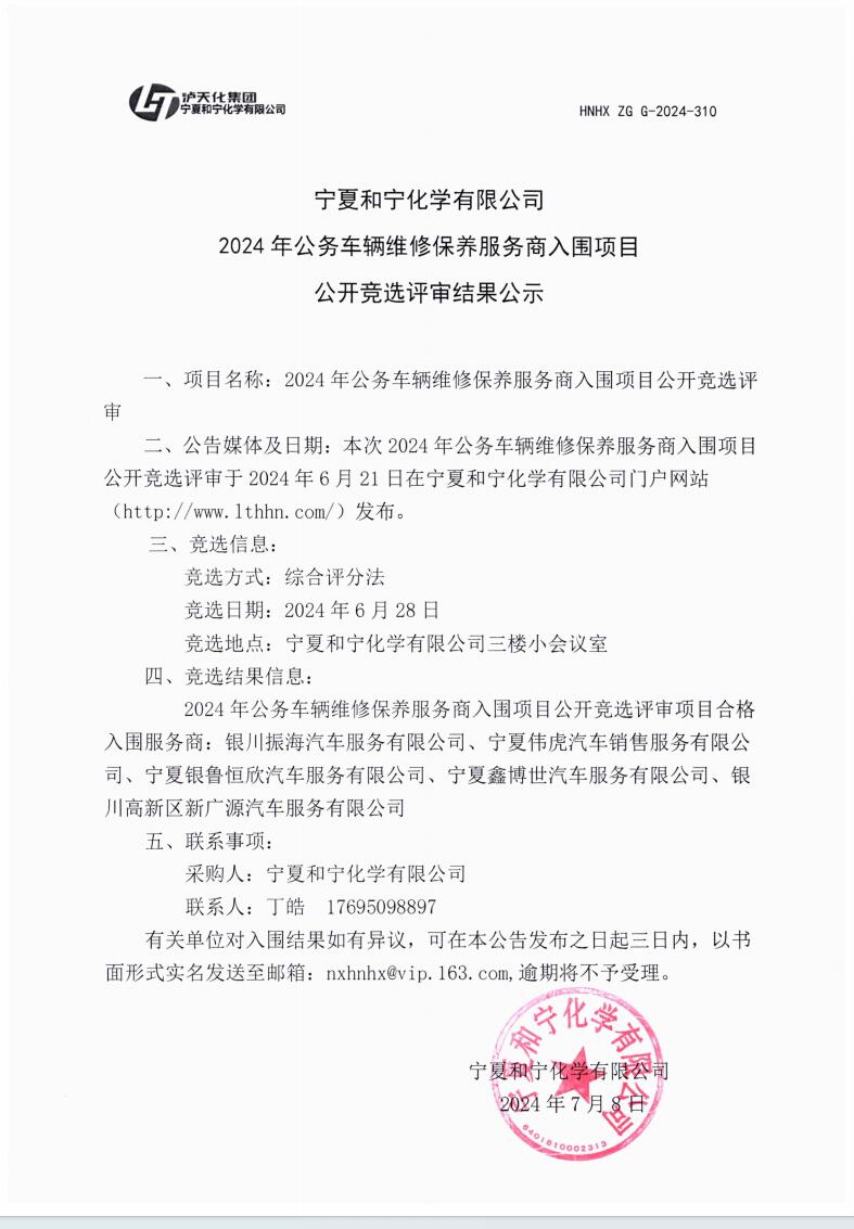 寧夏和寧化學有限公司2024年公務車輛維修保養服務商入圍項目公開競選評審結果公示.pdf [全文]