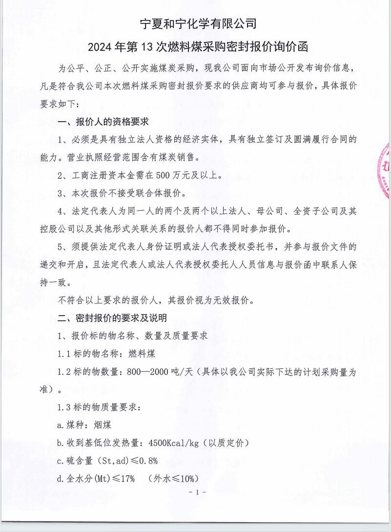 寧夏和寧化學有限公司2024 年第13 次燃料煤采購密封報價詢價函.pdf [全文]