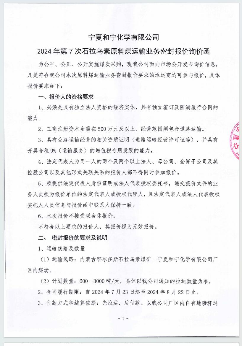 寧夏和寧化學有限公司2024 年第7次石拉烏素原料煤運輸業務密封報價詢價函.pdf [全文]