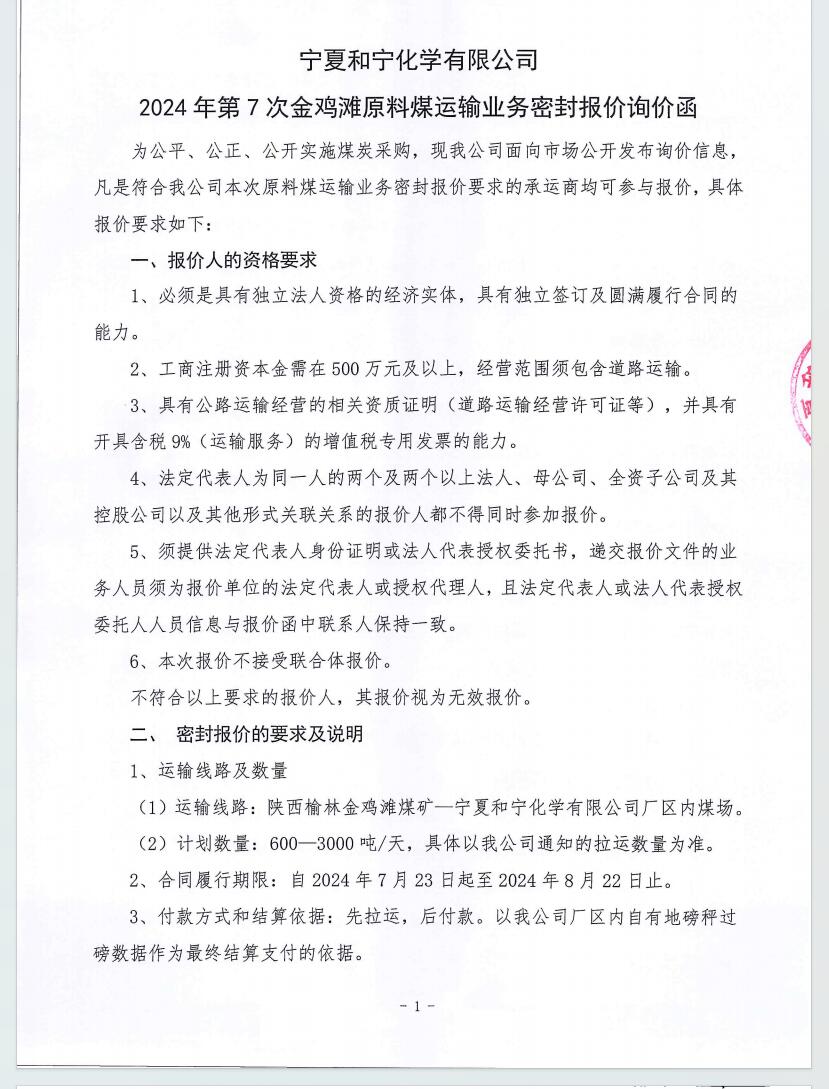 寧夏和寧化學有限公司2024年第7次金雞灘原料煤運輸業務密封報價詢函.pdf [全文]