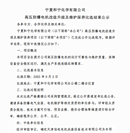 寧夏和寧化學(xué)有限公司高壓防爆電機(jī)改造升級(jí)及維護(hù)保養(yǎng)比選結(jié)果公示.pdf [全文]