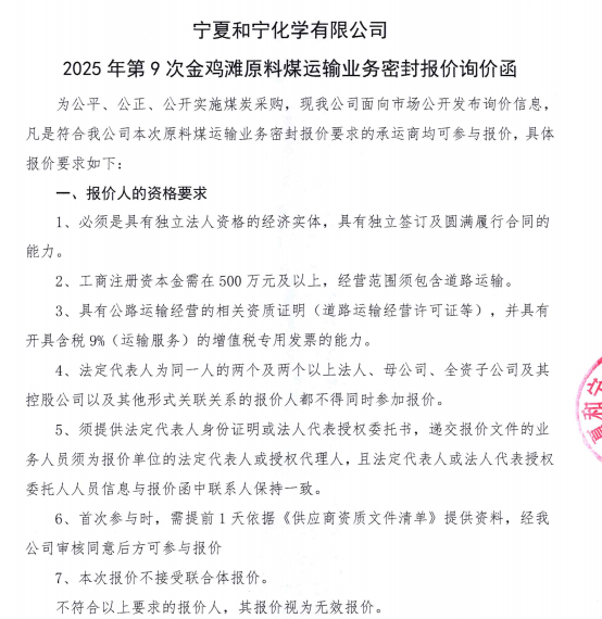 寧夏和寧化學(xué)有限公司2025年第9次金雞灘原料煤運(yùn)輸業(yè)務(wù)密封報(bào)價(jià)詢價(jià)函.pdf [全文]