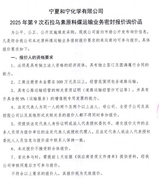 寧夏和寧化學(xué)有限公司2025年第9次石拉烏素原料煤運(yùn)輸業(yè)務(wù)密封報(bào)價(jià)詢價(jià)函.pdf [全文]