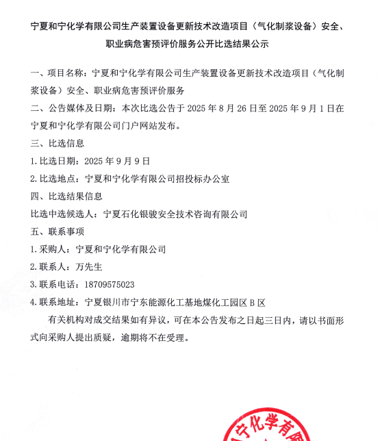 寧夏和寧化學(xué)有限公司生產(chǎn)裝置設(shè)備更新技術(shù)改造項(xiàng)目(氣化制漿設(shè)備)安全、職業(yè)病危害預(yù)評(píng)價(jià)服務(wù)公開比選結(jié)果公示.pdf [全文]