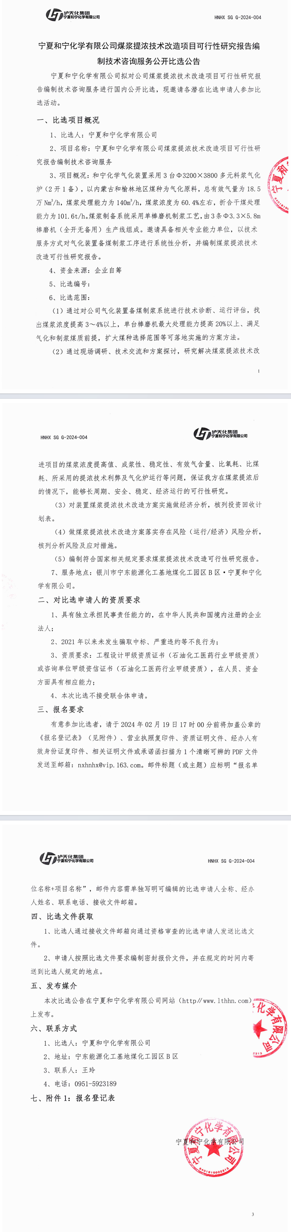 寧夏和寧化學有限公司煤漿提濃技術改造項目可行性研究報告編制技術咨詢服務公開比選公告附件 [全文]