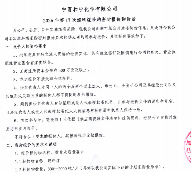 寧夏和寧化學有限公司2025年第17次燃料煤采購密封報價詢價函.pdf [全文]