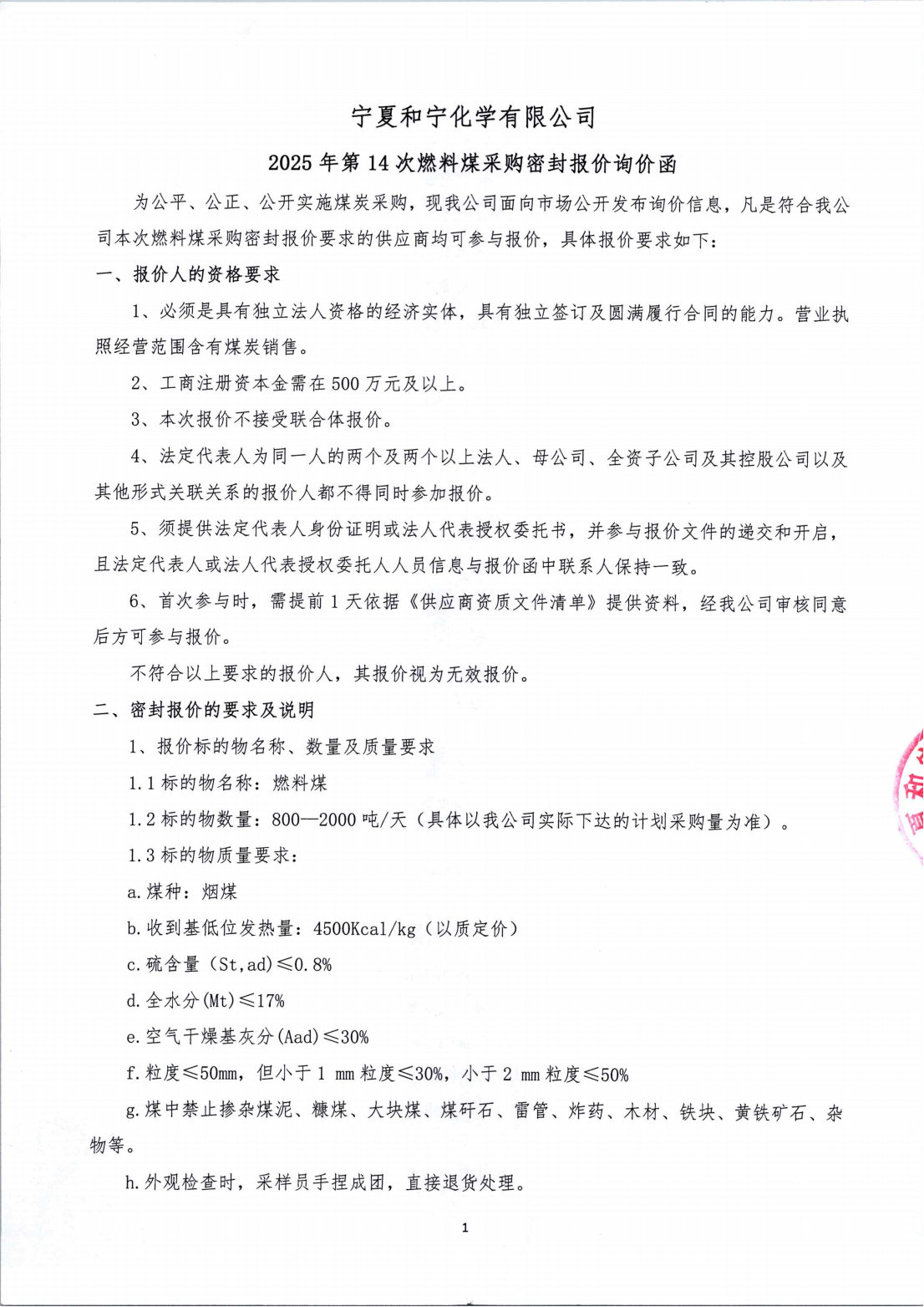 寧夏和寧化學(xué)有限公司2025年第14次燃料煤采購(gòu)密封報(bào)價(jià)詢(xún)價(jià)函附件下載 [全文]