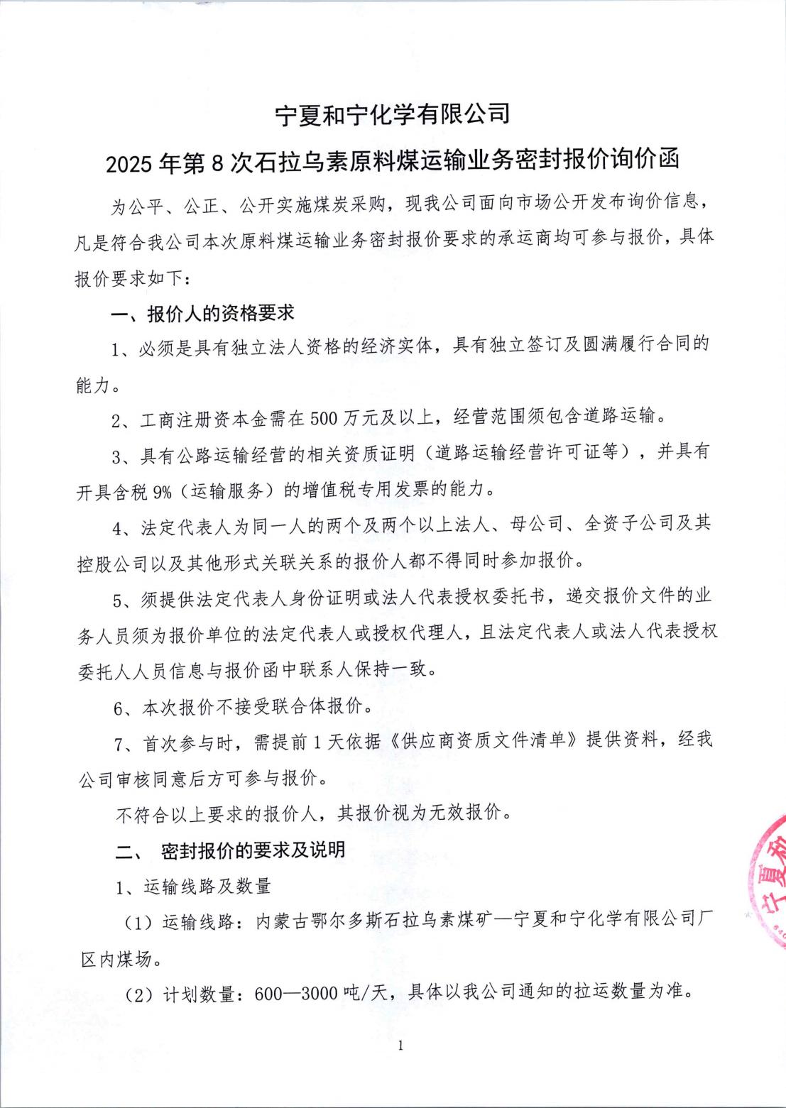 寧夏和寧化學(xué)有限公司2025年第8次金雞灘原料煤運(yùn)輸業(yè)務(wù)密封報(bào)價(jià)詢(xún)價(jià)函附件下載 [全文]