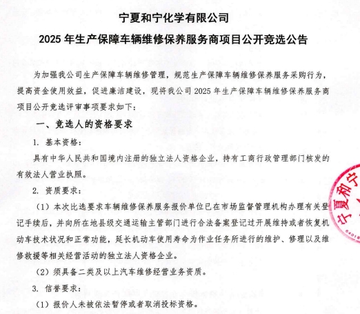 寧夏和寧化學有限公司2025年生產保障車輛維修保養服務商入圍項目公開競選公告.pdf [全文]