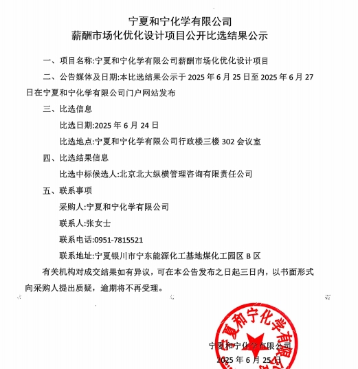 寧夏和寧化學有限公司薪酬市場化優化設計項目公開比選結果公示
