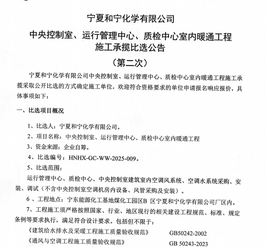 寧夏和寧化學有限公司中央控制室、運行管理中心、質檢中心室內暖通工程施工承攬比選公告(第二次).pdf [全文]