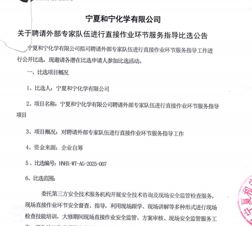寧夏和寧化學有限公司 關于聘請外部專家隊伍進行直接作業環節服務指導比選公告