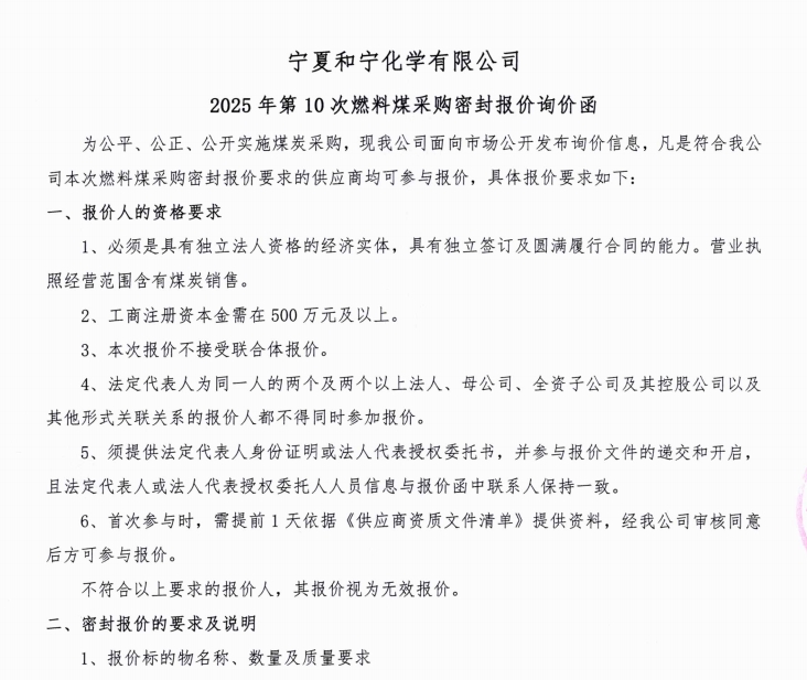寧夏和寧化學(xué)有限公司第2025年10次燃料煤采購密封報價詢價函.pdf [全文]