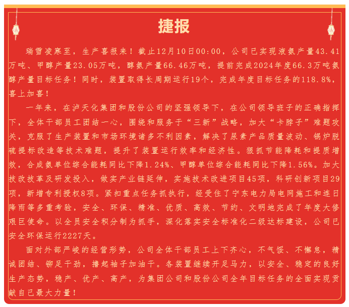 公司提前完成2024年醇氨產(chǎn)量及長周期目標(biāo)任務(wù)