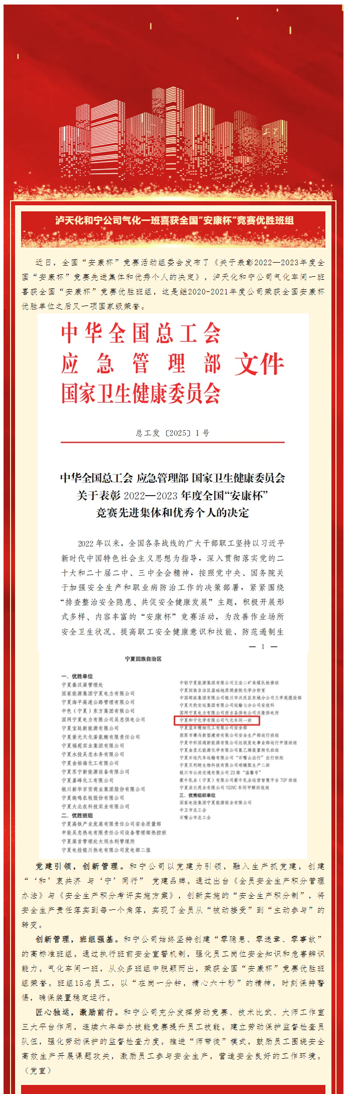 再獲國家級榮譽!瀘天化和寧公司氣化一班喜獲全國“安康杯”競賽優勝班組