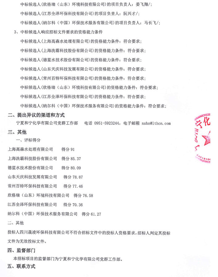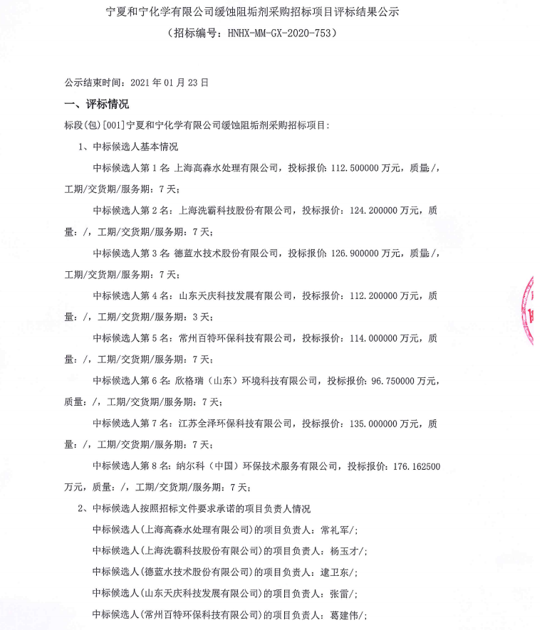 寧夏和寧化學(xué)有限公司緩蝕阻垢劑采購招標(biāo)項(xiàng)目評標(biāo)結(jié)果公示