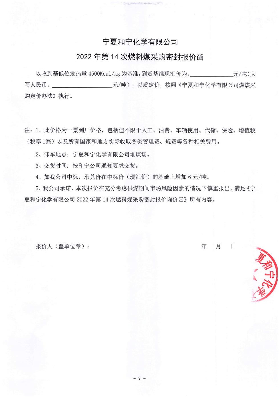 寧夏和寧化學有限公司2022年第14次燃料煤采購密封報價詢價函