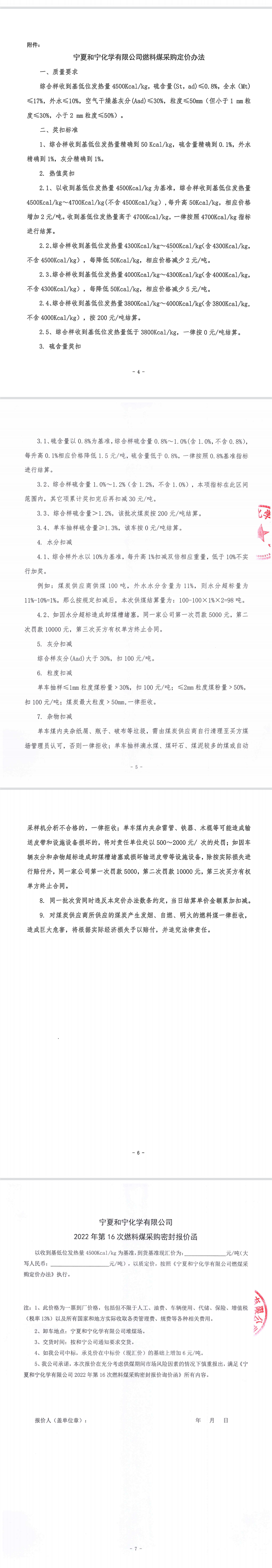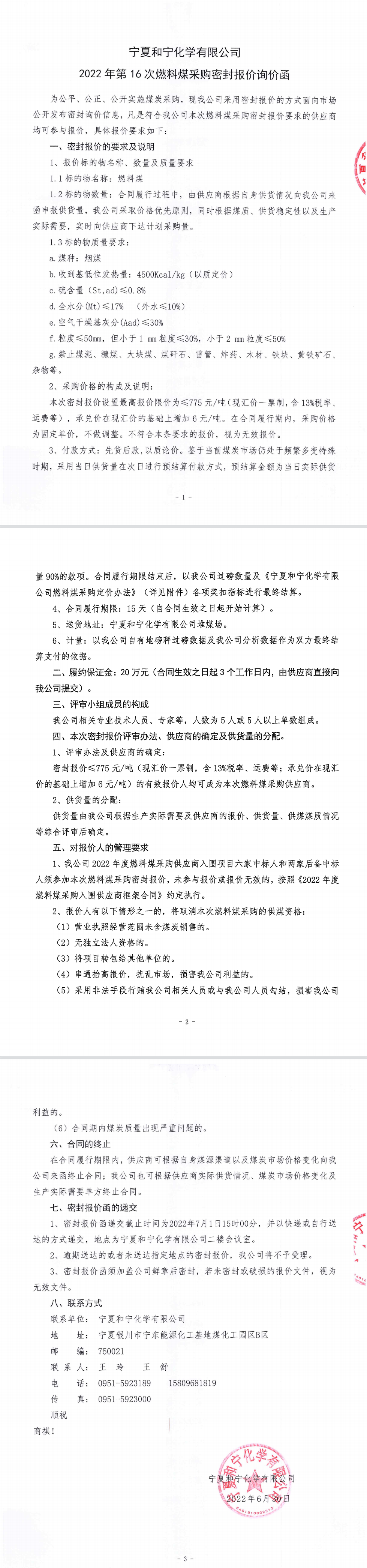 寧夏和寧化學有限公司2022年第16次燃料煤采購密封報價詢價函
