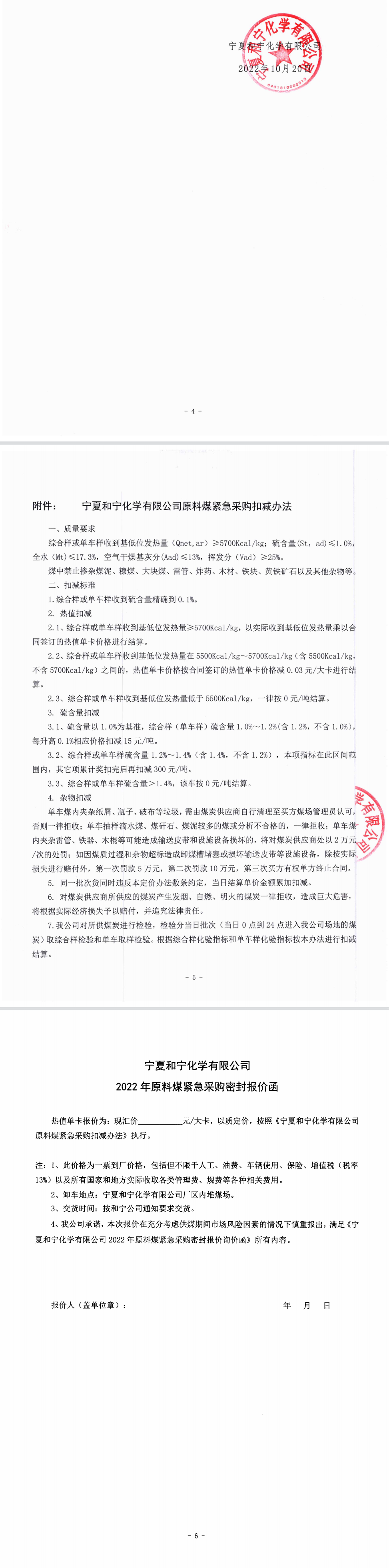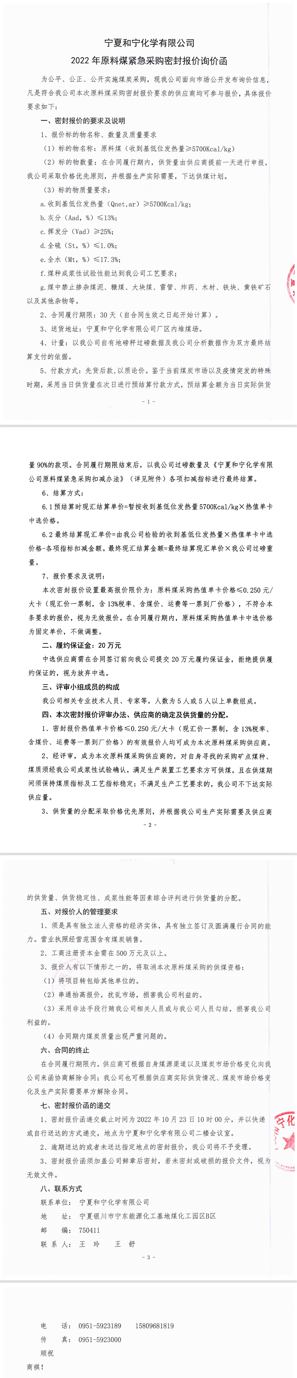寧夏和寧化學有限公司2022年原料煤緊急采購密封報價詢價函