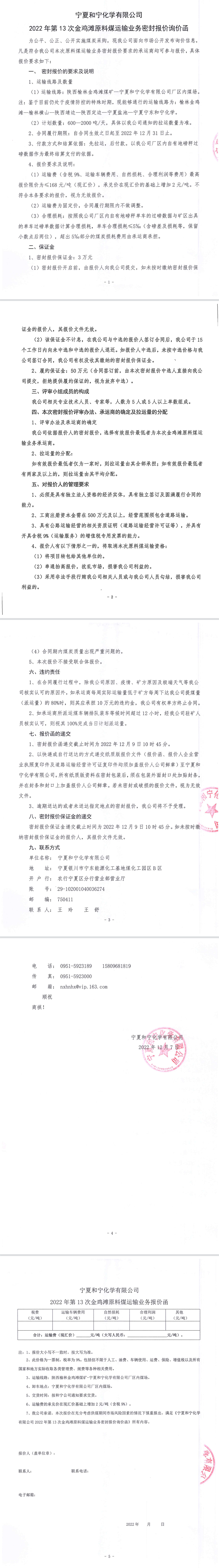 寧夏和寧化學(xué)有限公司2022年第13次金雞灘原料煤運(yùn)輸業(yè)務(wù)密封報(bào)價(jià)詢價(jià)函