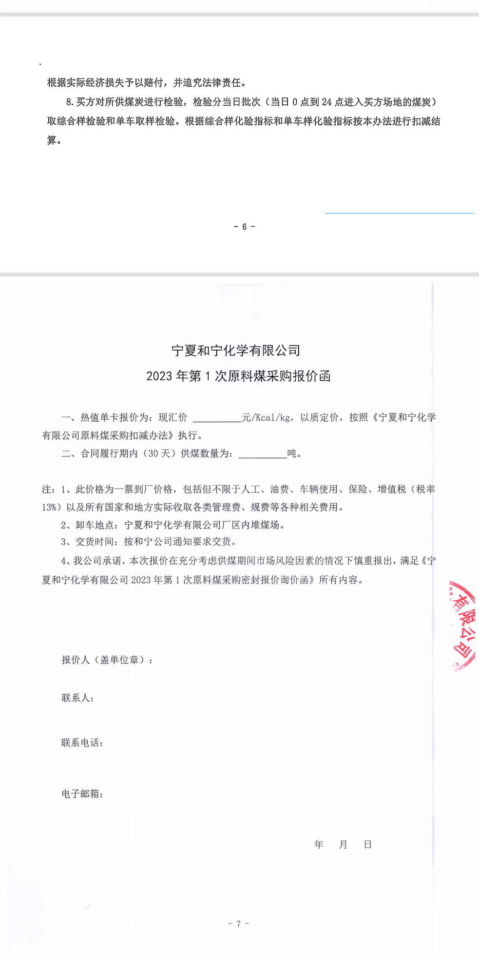 寧夏和寧化學有限公司2023年第1次原料煤采購密封報價詢價函