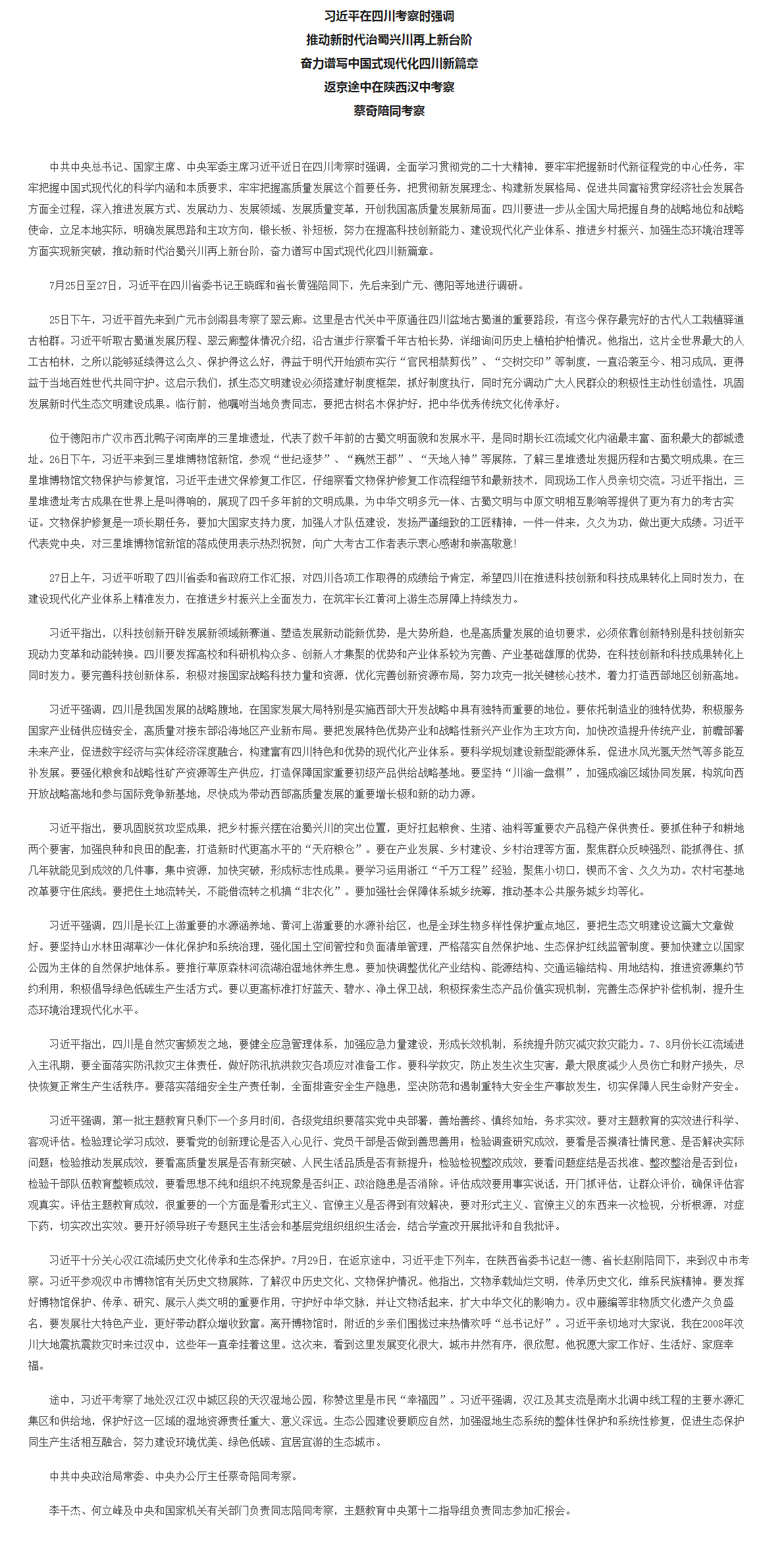 習近平在四川考察時強調 推動新時代治蜀興川再上新臺階 奮力譜寫中國式現代化四川新篇章 返京途中在陜西漢中考察