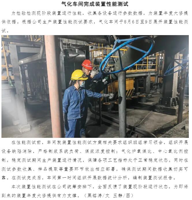 氣化車間完成裝置性能測試