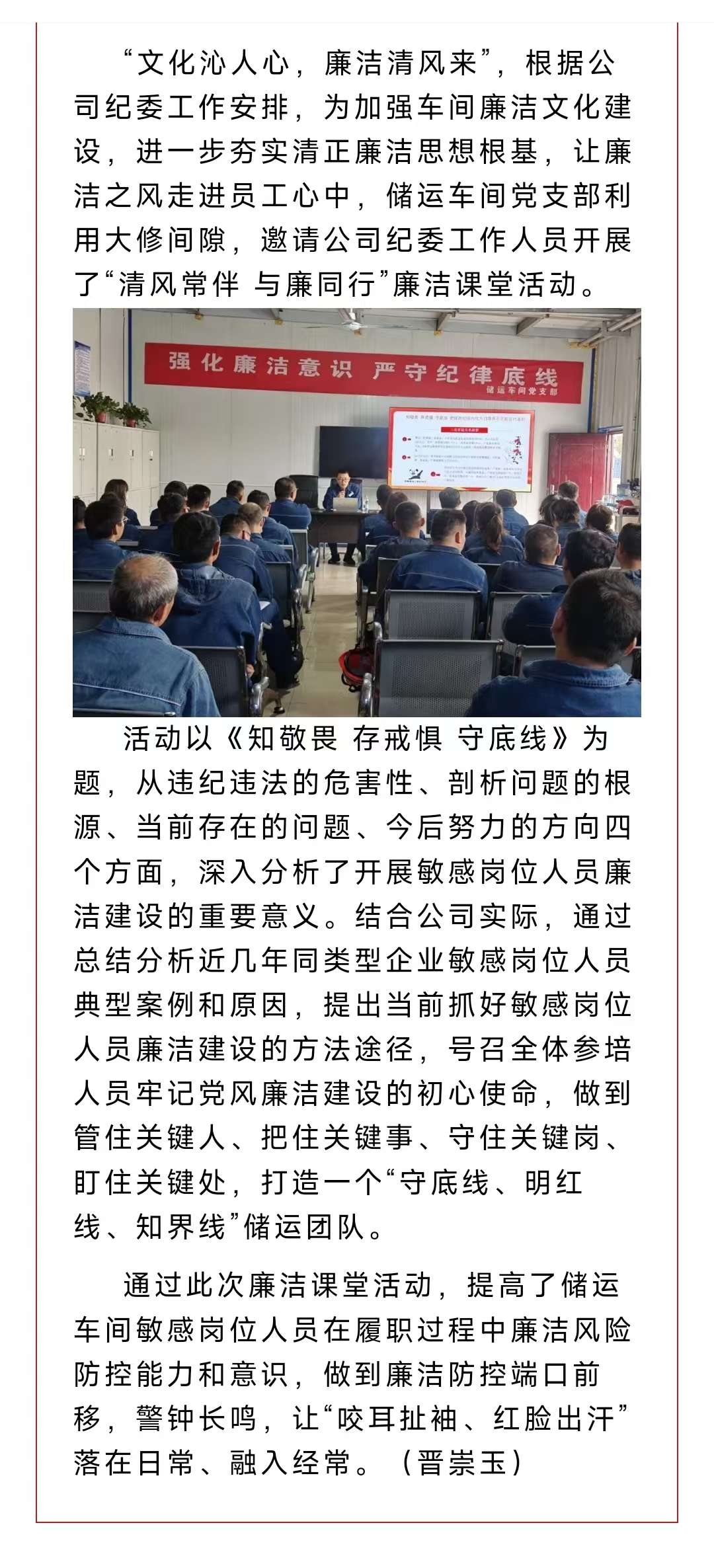 儲運車間黨支部開展“清風常伴 與廉同行”廉潔課堂活動