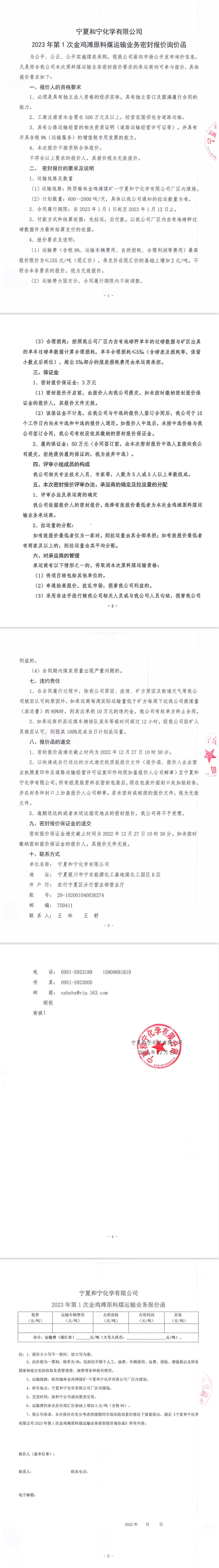 寧夏和寧化學(xué)有限公司2023年第1次金雞灘原料煤運(yùn)輸業(yè)務(wù)密封報(bào)價(jià)詢價(jià)函