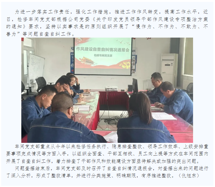 檢修車間黨支部組織開展作風建設自查自糾工作